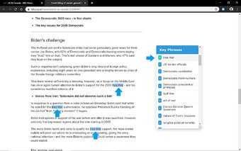 Imagine having a contents or glossary for a web page - that's exactly what Crammer provides. Once the text analytics is complete, a resizable popup appears over the web page, displaying the key phrases. Users can easily drag the popup anywhere on the screen by clicking on the "Key Phrases" title. And if the popup is getting in the way, there's a convenient toggle switch button to hide and show it.